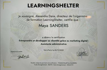 Mais la plus grande fierté de cette check-list n'est pas matérielle : J'ai obtenu ma certification « Entreprendre et développer sa clientèle grâce au marketing digital – Assistante administrative ». C'est l'élément qui concrétise et renforce la légitimité de cette aventure. Elle est la preuve que mes compétences sont validées et solides.